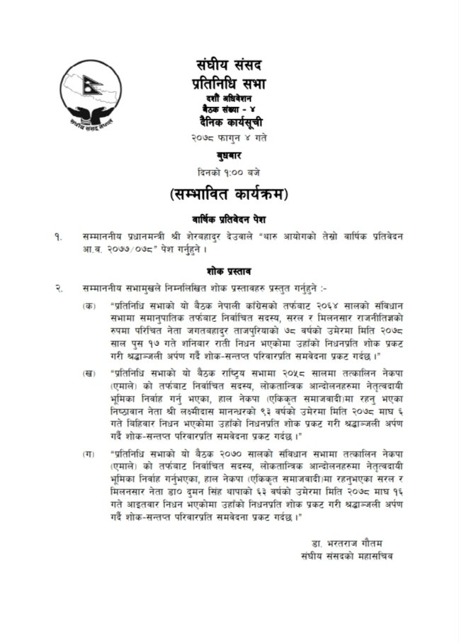 भोलिका लागि प्रकाशन भएको कार्यसूचीमा प्रधानमन्त्री शेरबहादुर देउवाले थारु आयोगको प्रतिवेदन पेस गर्ने र तीन जना पूर्व सांसदको निधनमा शोक प्रस्ताव पारित गर्ने उल्लेख छ ।