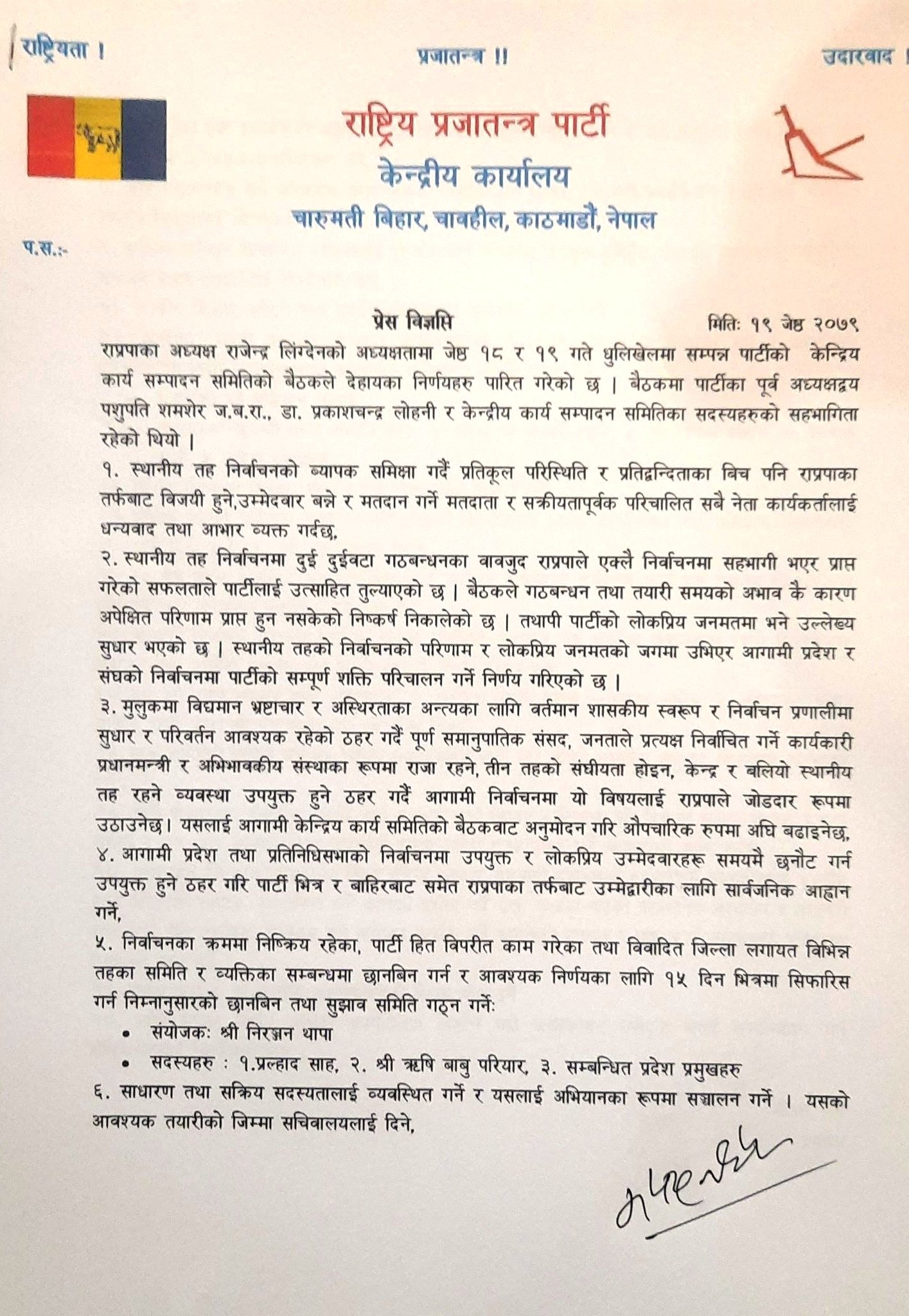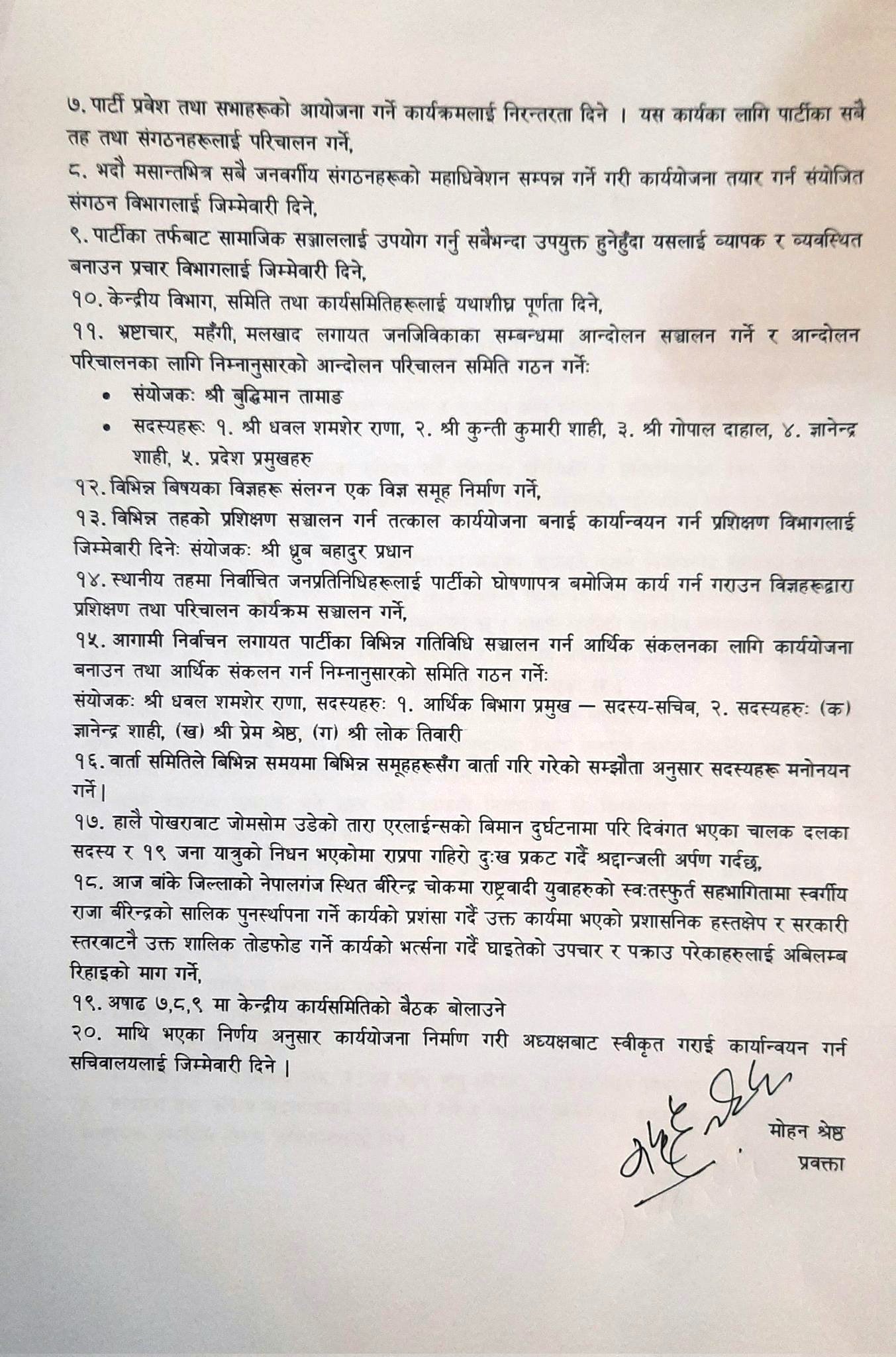 राप्रपाले महंगी र भ्रष्टाचारविरुद्ध आन्दोलन गर्ने, ज्ञानेन्द्र शाहीलाई सदस्यको जिम्मेवारी