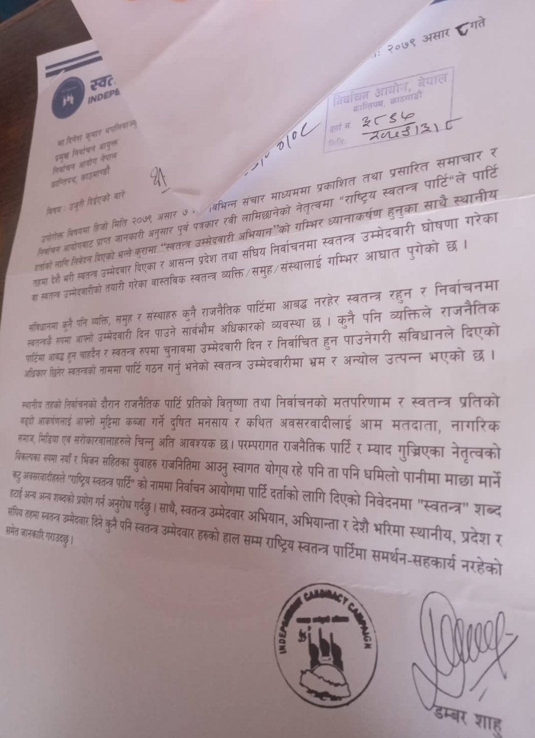 लामिछानेको पार्टीको नामप्रति आपत्ति जनाउँदै विरोधमा स्वतन्त्र उम्मेदवारी अभियानले पनि आयोगमा उजुरी दर्ता गराएको छ ।