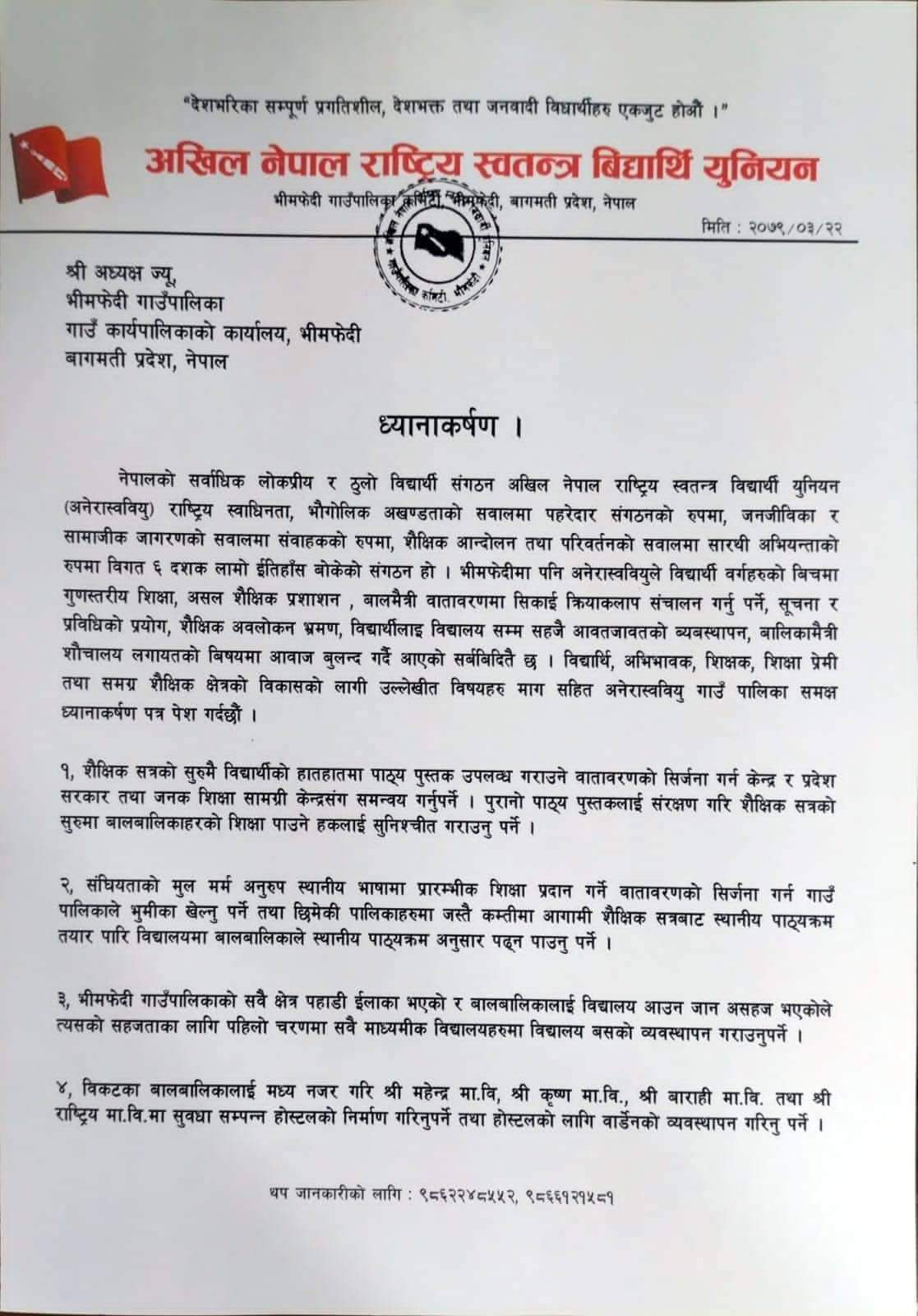 भीमफेदी / अनेरास्ववियु भीमफेदी कमिटिले बिद्यार्थीको समस्याहरुको वारेमा गाउँपालिकालाई ११ वुँदे ध्यानाकर्षण गरेका छन |