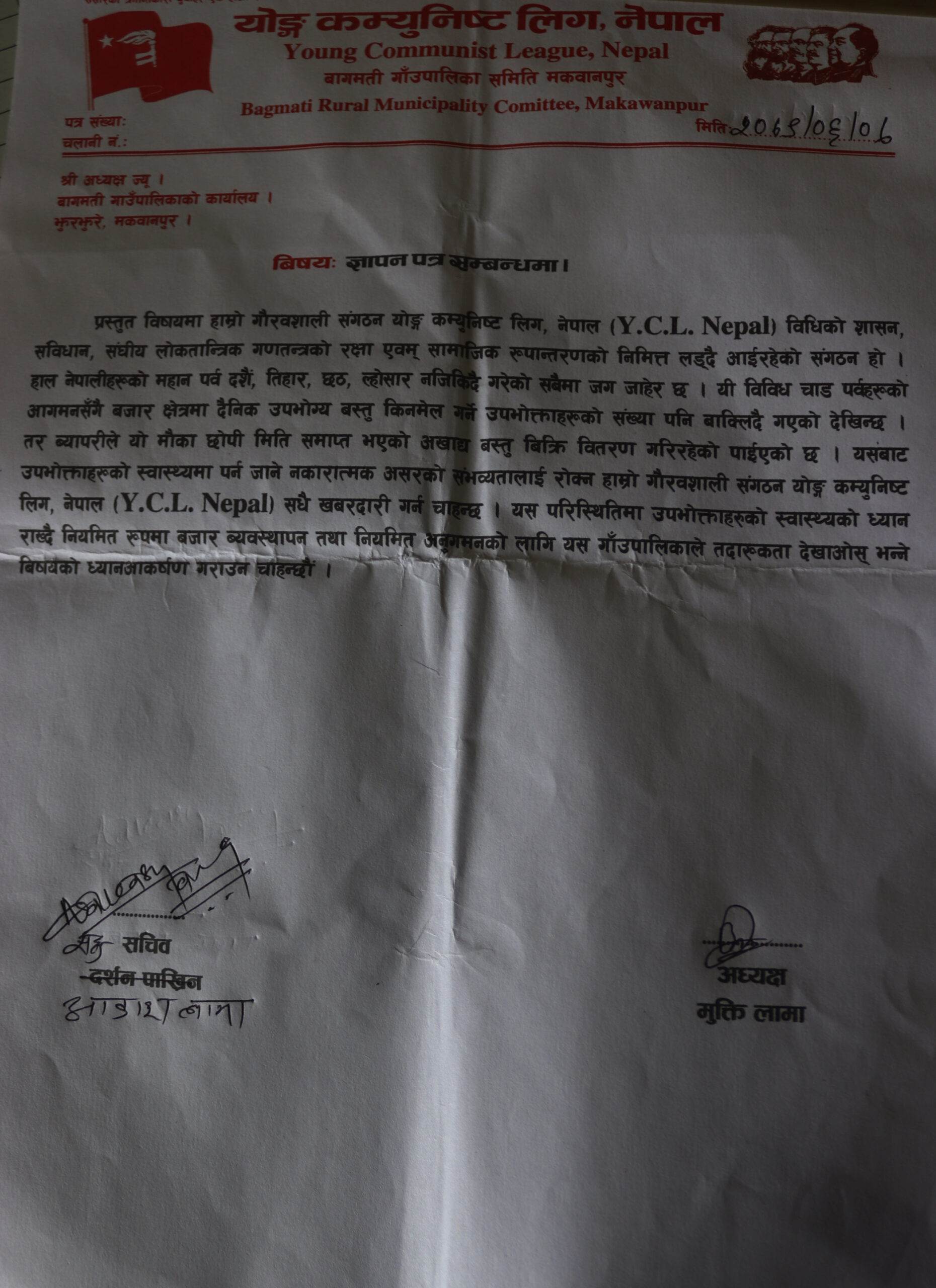 योङ्ग कम्युनिष्ट लिग (वाइसिएल) बागमतीले शुक्रबार गाउँपालिका अध्यक्ष सर्केश घलानलाई ध्यानाकर्षण पत्र बुझाएको हो । पसलहरुमा उपभोग्य बस्तुहरु म्याद नाघेको भेटिएको, मूल्य सूचि नराखी बेचेको तथा सरसफाईमा समेत ध्यान नदिई उपभोक्ताको स्वास्थ्यमा खेलवाड हुँदा पनि गाउँपालिकाले अनुगमनमा ध्यान नदिएको भन्दै ध्यानाकर्षण पत्र बुझाएको वाईसिएल बागमतीका अध्यक्ष मुक्ति लामाले बताए ।
