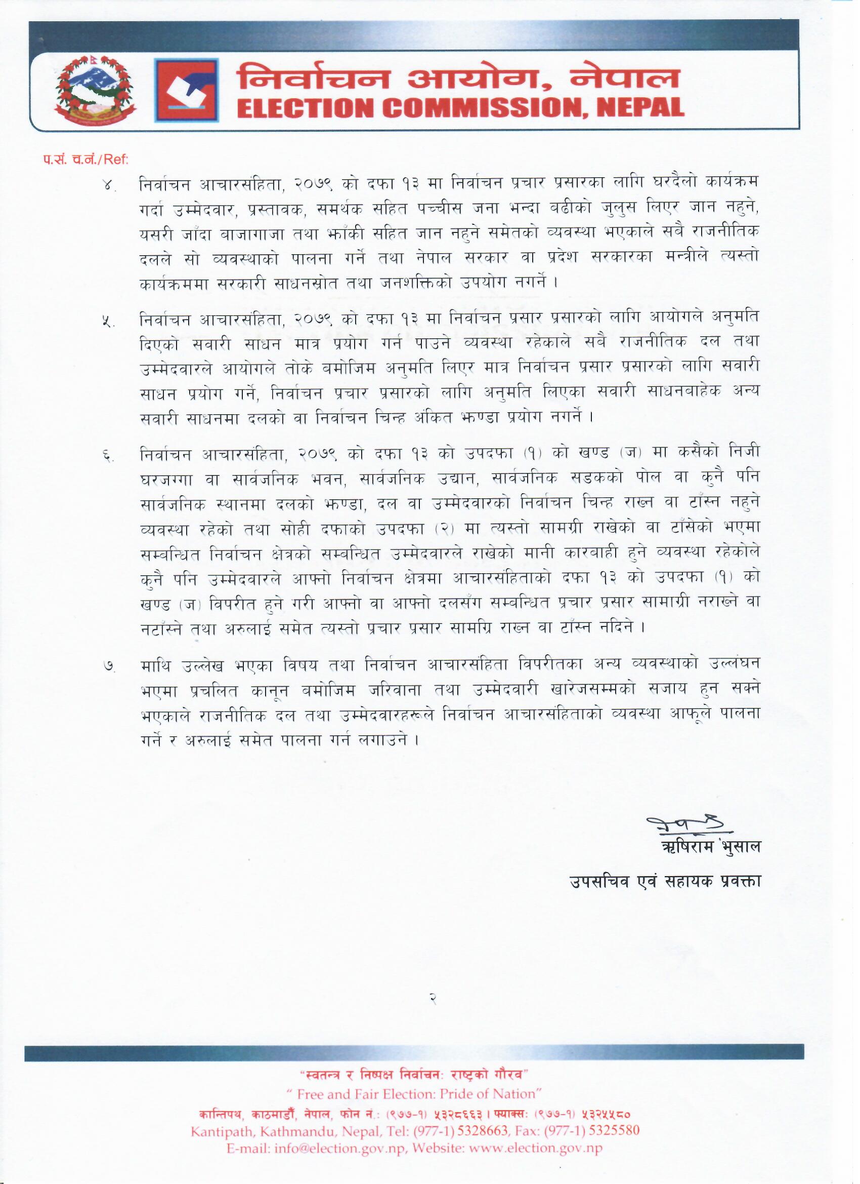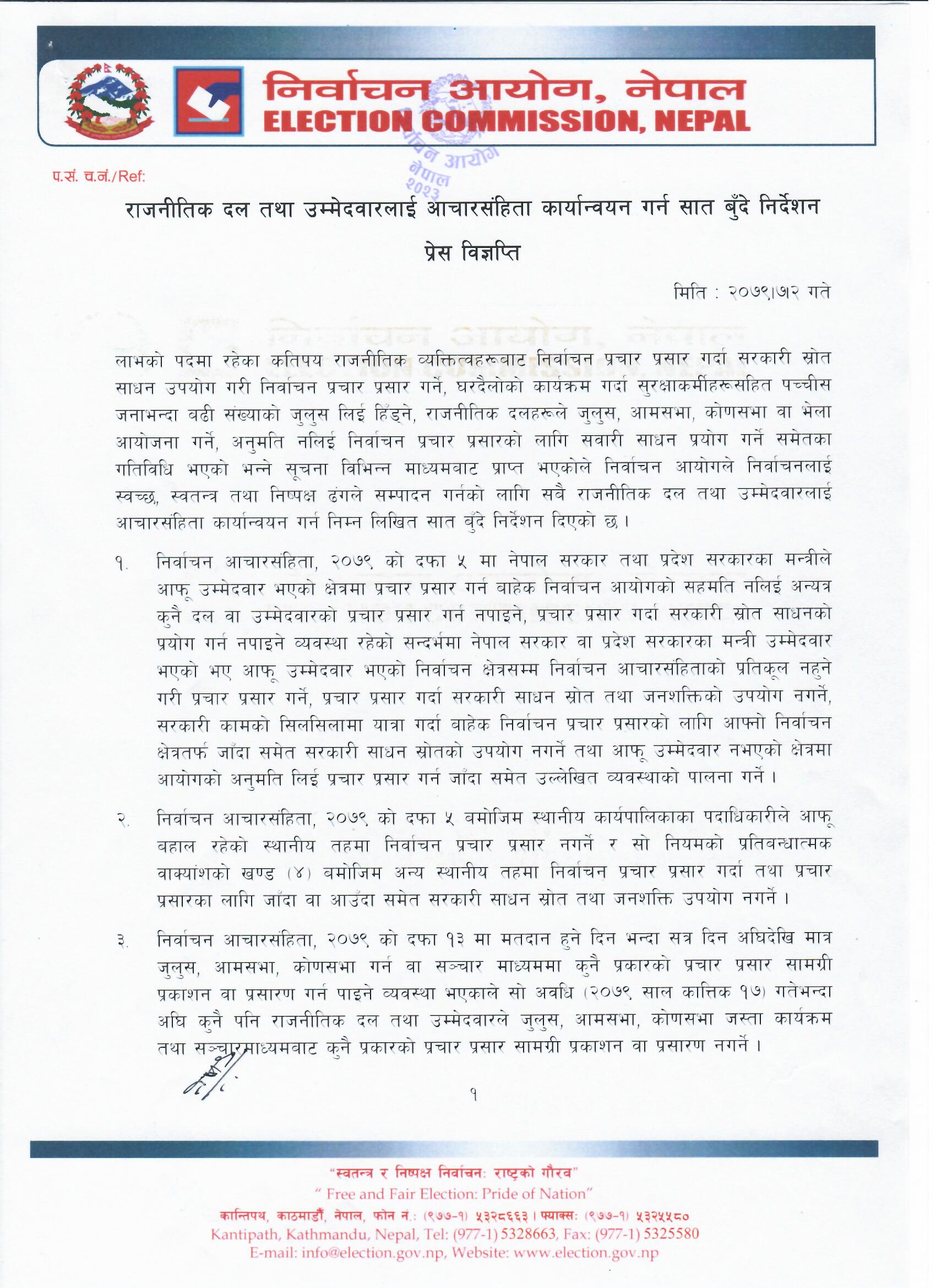 लाभको पदमा रहेका कतिपय राजनीतिक व्यक्तित्त्वबाट चुनावको प्रचार प्रसार गर्दा सरकारी स्रोत साधनको दुरुपयोग भएको, घरदैलोको कार्यक्रम गर्दा सुरक्षाकर्मीहरूसहित पच्चीस जनाभन्दा बढी संख्याको जुलुस लिई हिँडेको, राजनीतिक दलहरूले जुलुस, आमसभा, कोणसभा वा भेला आयोजना गर्ने, अनुमति नलिई निर्वाचन प्रचार प्रसारको लागि गाडीको प्रयोग गर्ने समेतका गतिविधि भएको भन्ने सूचना प्राप्त भएकोले निर्वाचन आयोगले चुनावलाई स्वच्छ, स्वतन्त्र तथा निष्पक्ष ढंगले सम्पादन गर्नसबै राजनीतिक दल तथा उम्मेदवारलाई आचारसंहिता कार्यान्वयन गर्न निर्देशन दिएको हो ।