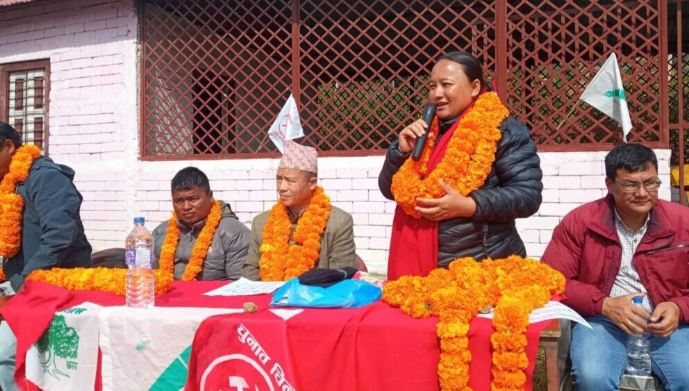 बागमती प्रदेशकी सामाजिक विकास मन्त्री समेत रहनुभएको उहाँले उक्त क्षेत्रमा आफुले बजेट विनियोजन गर्न पहल गरेकाले चुनाबमा सबैले सहयोग गर्नुपर्नेमा जोड दिनुभयो । ‘म दाबीको साथ भन्छु गठबन्धनको सरकार नभएको भए यहाँ यत्तिको बजेट आउने थिएन।’ उहाँले भन्नुभयो । उहाँले सबै धर्म, समुदाय र क्षेत्रलाई समान रुपमा हेरी बजेट हालेकाले अब कांग्रेस, माओवादी र समाजवादीकै गठबन्धन सरकार बन्ने जिकिर गर्नुभयो ।