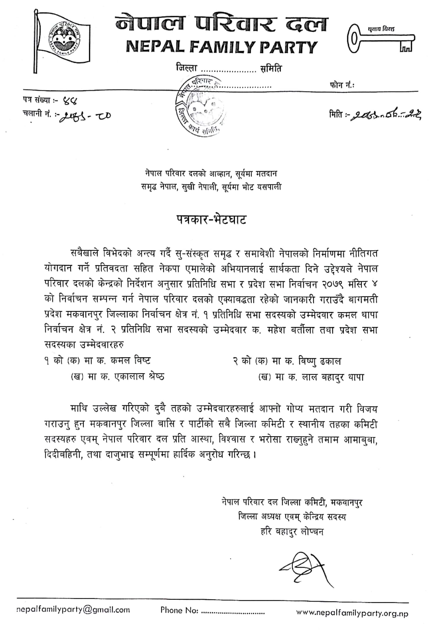 मंसिर ४ गते हुने चुनावमा नेकपा एमालेका प्रतिनिधीसभा क्षेत्र नम्बर–१ का उम्मेदवार कमल थापा, क्षेत्र नम्बर–१ को (क) का उम्मेदवार कमल विष्ट, (ख) का उम्मेदवार एकालाल श्रेष्ठ, क्षेत्र नम्बर–२ का उम्मेदवार महेश कुमार बर्तौला, क्षेत्र नम्बर–२ को (क) का उम्मेदवार विष्णु प्रसाद ढकाल र (ख) का उम्मेदवार लाल बहादुर थापालाई मतदान गर्ने उहाँले पत्रकार सम्मेलनमा जानकारी गराउनुभयो ।