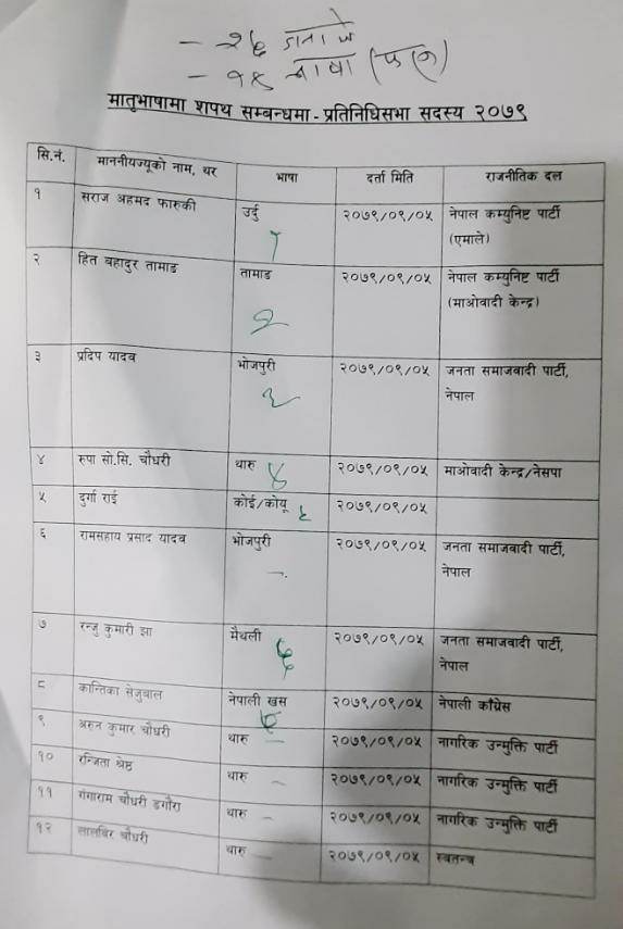 धमलाका अनुसार सांसदहरूले उर्दु, तामाङ, भोजपुरी, थारु, कोइरकोयू, मैथली, नेपाली खस, मधेसी भाषा, सन्याली भाषा, नेपाल भाषा, अवधि, नेपालीरमुस्लिम, हिन्दी र संस्कृत भाषामा शपथ लिनेछन् ।