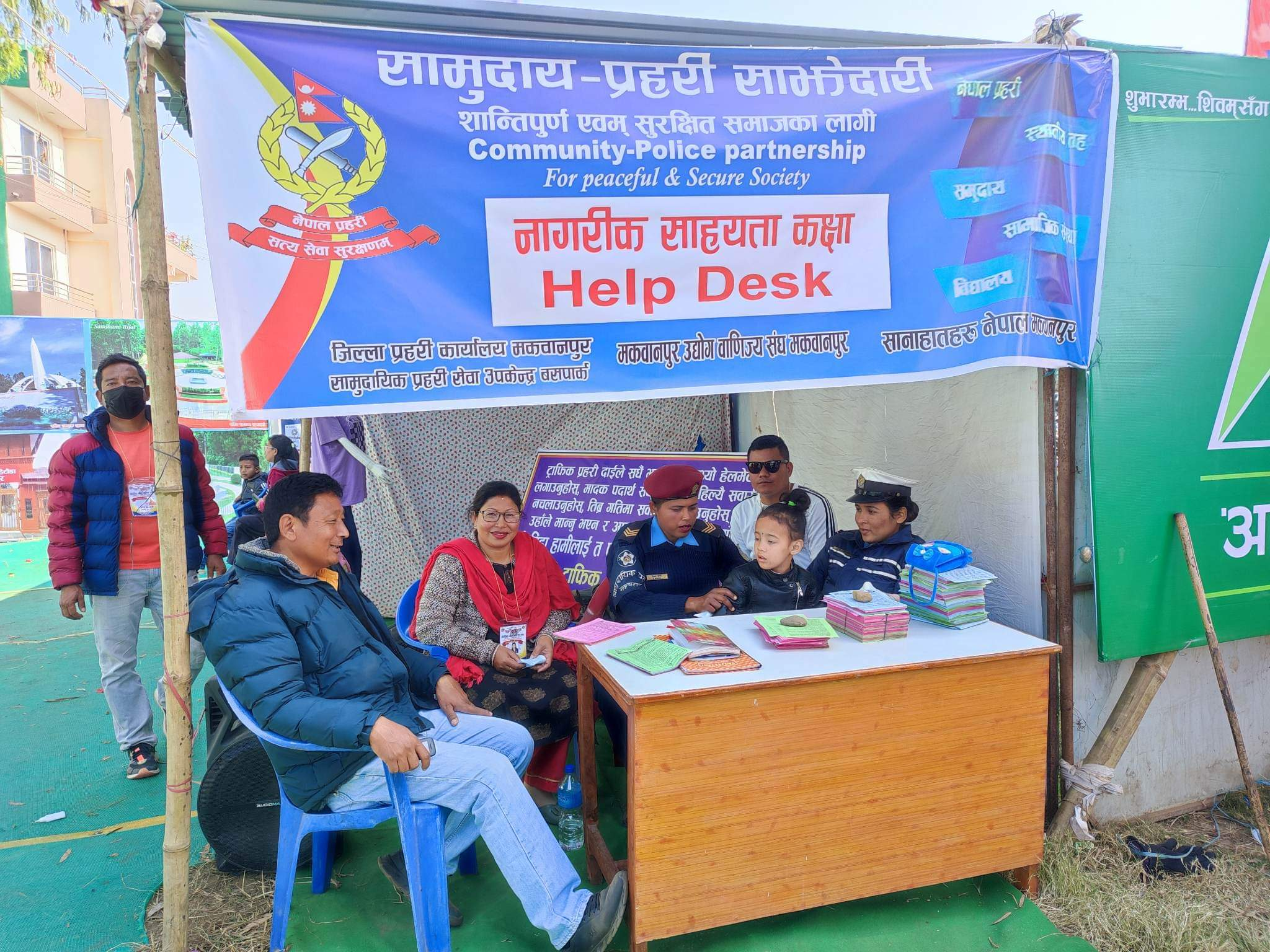 हेटौंडा / हेटौंडा हेटौंडामा जारी १० औं राष्ट्रिय औद्योगिक व्यापार महोत्सव २०७९ मा जिल्ला प्रहरी कार्यालय मकवानपुर र सामूदायिक प्रहरी उपसेवा केन्द्र बसपार्कको आयोजनामा सानाहातहरु नेपाल मकवानपुरको सहकार्य तथा मउवा संघको समन्वयमा संयुक्त रुपमा नागरिक सहायता कक्ष राखी सचेतना कार्यक्रम भइरहेको छ ।