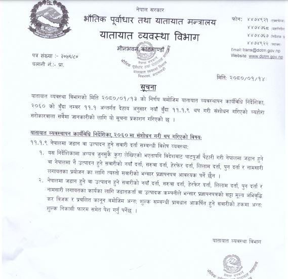 अब नेपालमा जडान वा नेपालमै उत्पादन हुने सबै गाडीको नयाँ दर्ता, सरुवा दर्ता, हेरफेर दर्ता, लिलाम दर्ता, पुनः दर्ता र नामसारीलगायत प्रयोजनका लागि भन्सार प्रज्ञापन पत्र आवश्यक नपर्ने व्यवस्था गरिएकोे छ । तर यसको सट्टामा मूल्य अभिवृद्धि कर बिजक पेस गर्नुपर्ने विभागले जनाएको छ ।