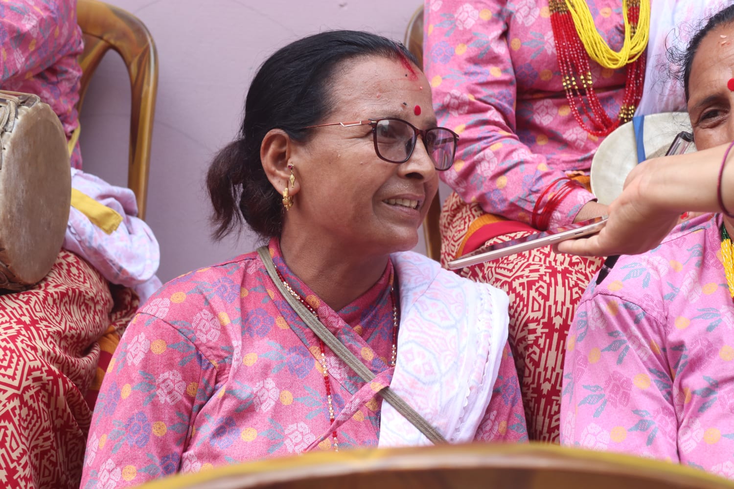 नजिकै बसेका केही छिमेकी पुरुषहरु दंग परेर बाजा बजाउने महिलाको समूहलाई हेर्दै तारिफ गर्दै थिए।