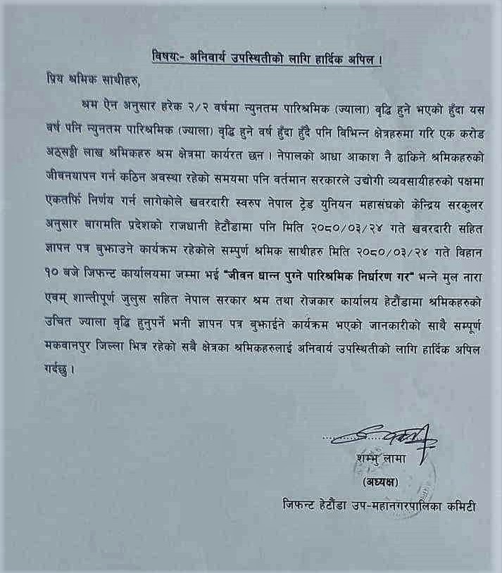 उक्त ज्ञापनपत्र बुझाउने कार्यक्रममा मकवानपुर जिल्ला भित्र रहेका सबै श्रमिकहरुलाइ उपस्थित हुन अनुरोध समेत गरिएको छ।