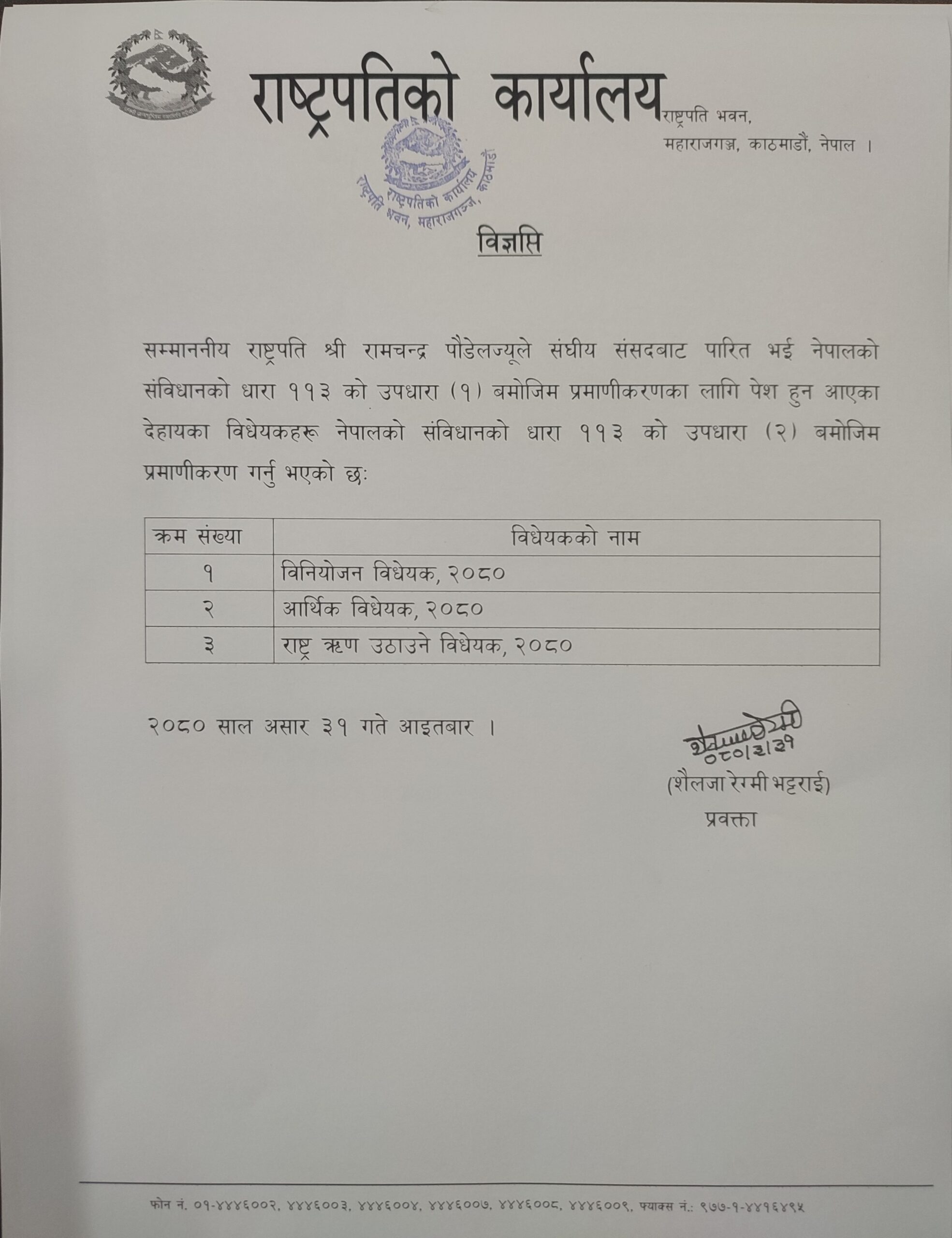 संघीय संसदबाट पारित भई नेपालको संविधानको धारा ११३ को उपधारा (१) बमोजिम प्रमाणीकरणका लागि पेश हुन आएका तीनवटा विधेयकहरू नेपालको संविधानको धारा ११३ को उपधारा (२) बमोजिम राष्ट्रपतिले प्रमाणीकरण गरेका राष्ट्रपतिको कार्यालयले जनाएको छ।