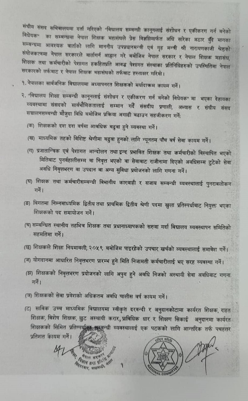 सरकारले संसदमा पेस गरेको सहमतिको मस्यौदामा विद्यालय शिक्षासम्बन्धी कानुनलाई संशोधन र एकीकरण गर्न बनेको विधेयकमा भएका केही व्यवस्थाहरू परिवर्तन गर्न संसद्को सार्वभौमिकतालाई सम्मान गर्दै संसदीय प्रणाली, अभ्यास र सङ्घीय संसद् सञ्चालनसम्बन्धी मौजुदा विधि बमोजिम प्रक्रिया अगाडि बढाउने सहमति भएको छ । यस्तै शिक्षकको समायोजन, तहगत प्रणाली र आवधिक बढुवाका विषयमा नेपाल शिक्षक महासङ्घ र विज्ञसमेतको प्रतिनिधित्व हुने गरी अध्ययन समिति गठन गर्ने र समितिको प्रतिवेदन बमोजिम आवश्यक कानुनी प्रबन्ध गर्ने पनि सहमति भएको छ ।