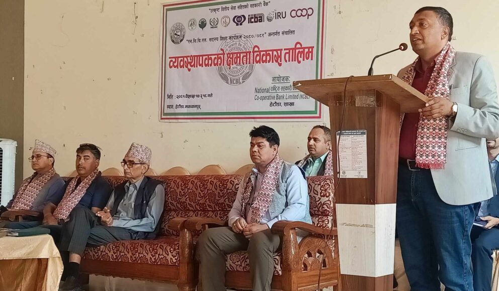 हेतौडाको रोयल प्यालेसमा सुरु भएको तालिममा राष्ट्रिय सहकारी बैंकका प्रशिक्षक बल्लभ तिमिल्सिना र झलेन्द्र दाहालले सहजीकरण गरेकाछन् । बैंकको एन।सि।बि।एल। सदस्य शिक्षा कार्यक्रम २०८०र८१ अन्तर्गत २ दिने ुव्यवस्थापकको क्षमता विकासु तालिम संचालन गरिएको राष्ट्रिय सहकारी बैंकका बागमती प्रदेश प्रमुख रामेश्वर अर्यालले बताउनुभयो ।