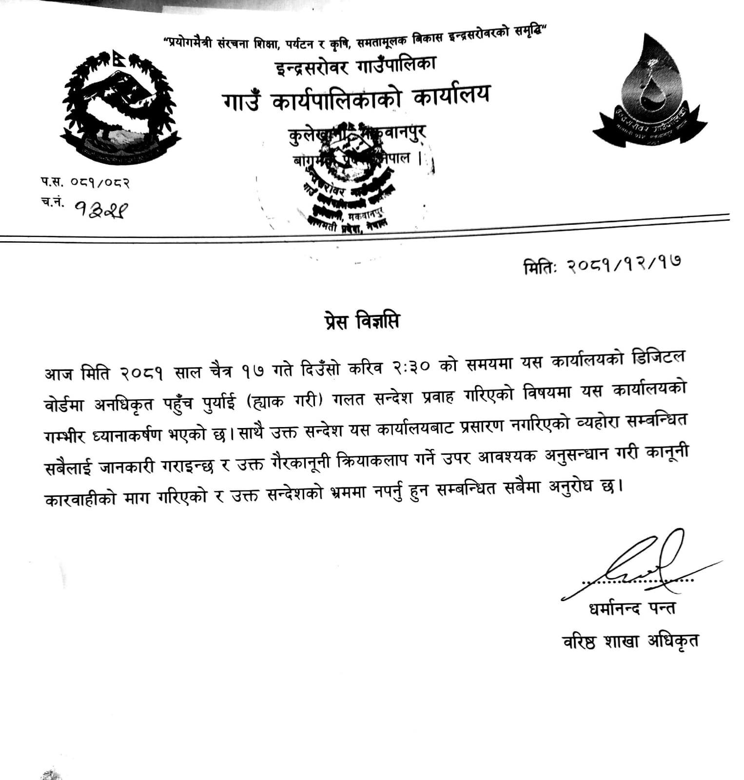 गाउँपालिकाको विज्ञप्ति अनुसार, २०८१ साल चैत्र १७ गते दिउँसो करिब २:३० बजे (आज) कार्यालयको डिजिटल बोर्डमा अनधिकृत पहुँच पुर्याई (ह्याक) गरेर उक्त सन्देश प्रवाह गरिएको जनाएकाे छ । पालिकाले यस घटनाप्रति गम्भीर ध्यानाकर्षण भएको जनाएको छ र यसलाई गैरकानूनी क्रियाकलापको रूपमा व्याख्या गर्दै दोषी उपर आवश्यक अनुसन्धान गरी कानूनी कारबाहीको माग समेत गरेको छ।