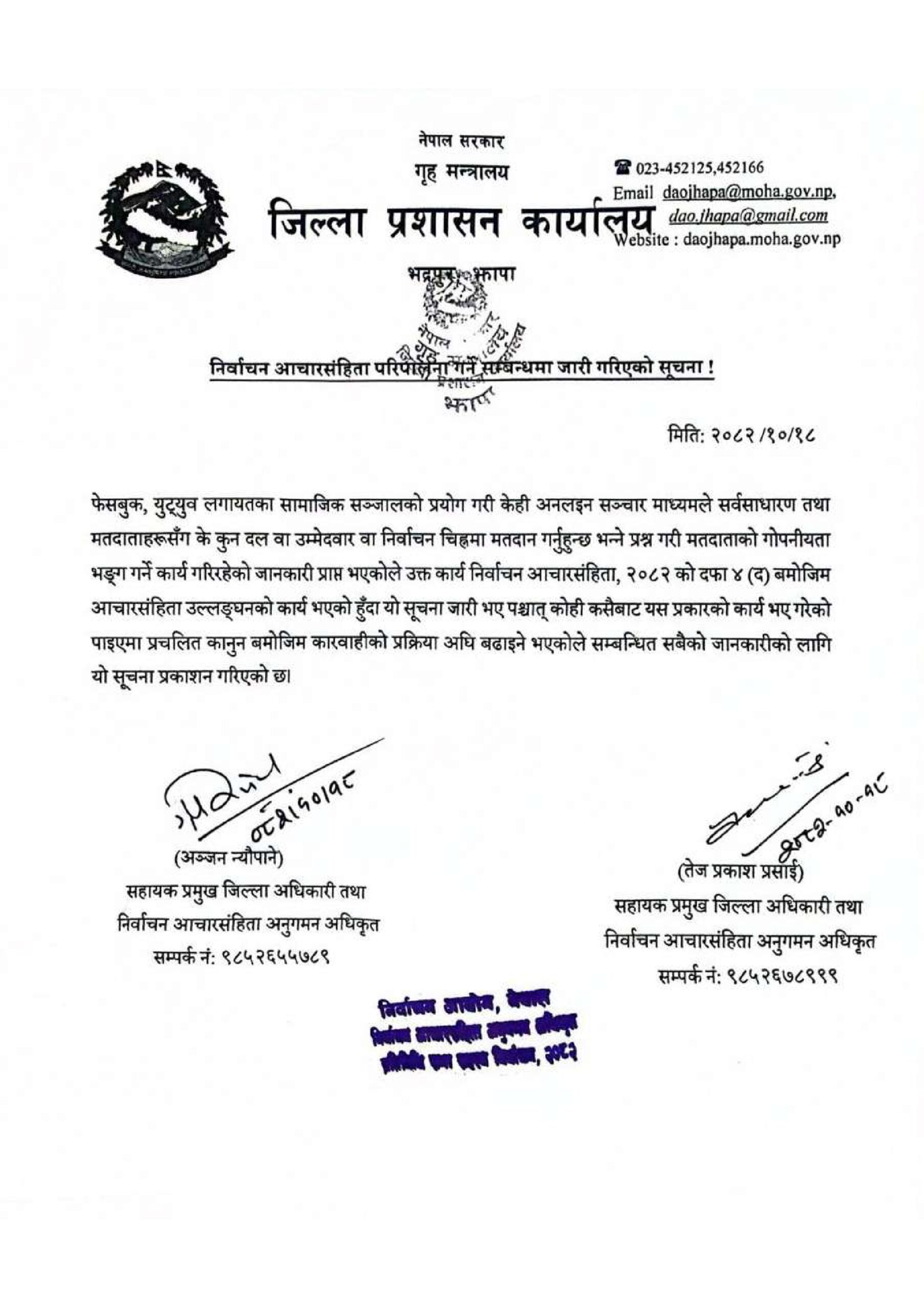 सहायक प्रमुख जिल्ला अधिकारी तथा अनुगमन अधिकृत तेजप्रसाद प्रसाइँ र अञ्जन न्यौपानेले सूचना जारी गर्दै उल्लंघन गरे कानुनअनुसार कारबाही हुने बताएका छन् । निर्वाचन आयोगको सामाजिक सञ्जाल र खर्च नियन्त्रणसम्बन्धी कडाइले झापा–५ का उम्मेदवार केपी शर्मा ओली र बालेन शाहजस्ता डिजिटल रूपमा प्रभावशाली नेताहरूलाई नयाँ चुनौती थपिएको छ ।
