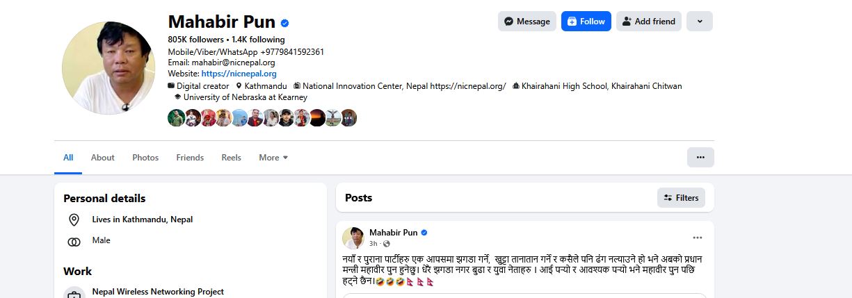 उनी सामाजिक सञ्जालमा लेख्छन्, ‘नयाँ र पुराना पार्टीहरू एकआपसमा झगडा गर्ने, खुट्टा तानातान गर्ने र कसैले पनि ढंग नल्याउने हो भने अबको प्रधानमन्त्री महावीर पुन हुनेछु। धेरै झगडा नगर बुढा र युवा नेताहरू । आइपऱ्यो र आवश्यक पऱ्यो भने महावीर पुन पछि हट्ने छैन ।’
