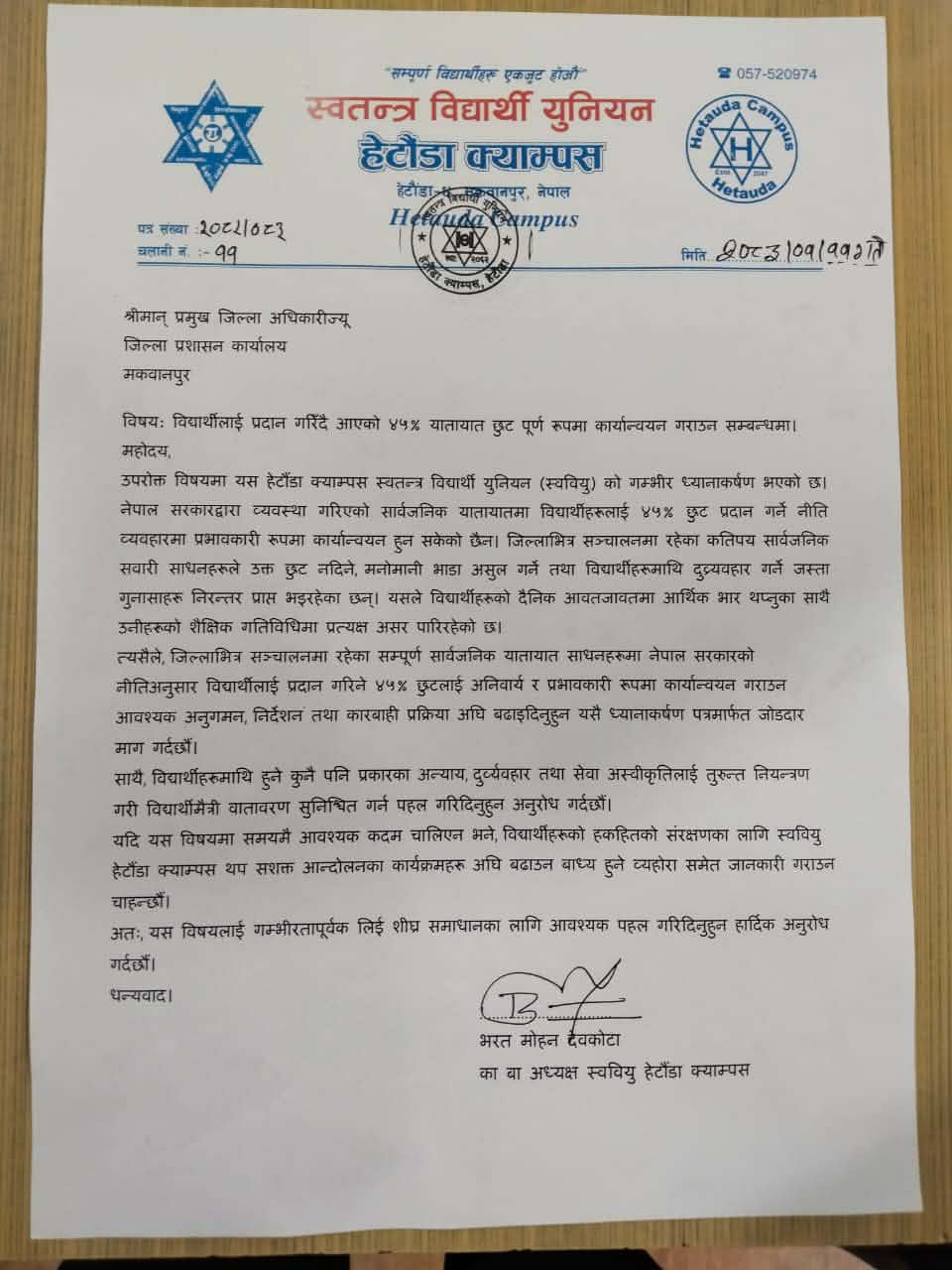 हेटौंडा / मकवानपुरमा विद्यार्थीहरूले पाउँदै आएको ४५ प्रतिशत यातायात छुट पूर्ण रूपमा कार्यान्वयन गर्न माग गर्दै प्रमुख जिल्ला अधिकारीलाई ध्यानाकर्षण पत्र बुझाएका छन्।